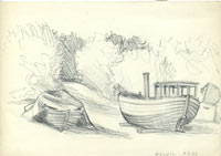 also Unikate oder Einzelstücke. Bei Georg Seyler betrifft dies Handzeichnungen, Skizzen, Pastelle und Federzeichnungen. Freie Druckgrafik wie Radierungen oder Stiche sind mir bis jetzt nicht bekannt. Reise- und andere Skizzen Grundlage aller Gemälde und Federzeichnungen der späteren Jahre (nach 45) waren kleinformatige Skizzen (ca A5) mit Bleistift oder Kugelschreiber, die er auf Reisen oder vor Ort anfertigte. Dabei wurden in wenigen Minuten die grossen kompositorischen Elemente eines Motives festgehalten, ohne gross auf Details einzugehen. Insbesondere die Farbe wurde manchmal nur als Bemerkungen in der Skizze notiert, ansonsten rekonstruierte oder kreierte er sie später an der Staffelei aus dem Gedächtnis. Erst der von der Fa Ayata zur Verfügung gestellte Nachlaß mit mehreren hundert Blättern aller Epochen, ermöglichte mir einen umfassenden Einblick in diese Urquellen seiner malerischen und zeichnerischen Werke. Oft mit detaillierten Angaben zu Ort, Zeit und Umständen versehen, inklusive der Notiz, wann er welches spätere Werk nach dieser Skizze verfertigte, bilden diese Skizzen auch eine Art bebildertes Tagebuch seines Lebens. Im Vergleich mit den Gemälden und Federzeichnungen ergeben sich interessante Rückschlüsse auf seine Arbeitsweise und Schaffensjahre. Die Selbstporträts Eine besondere Gruppe unter allen Handzeichnungen bilden die Selbstporträts. Seit seinem 14. Lebensjahr sind Selbstbildnisse dokumentiert, durch alle Jahrzehnte, einschließlich des Krieges. Diese wurden deshalb aus den anderen Rubriken herausgelöst und in einer Gruppe zusammengefasst. Hier gibt es auch einen Mix der verschiedensten Techniken, Aquarell in den Jugendjahren, später Bleistift und Kugelschreiber, selten auch Kreidezeichnungen. Die Federzeichnungen Obwohl seiner künstlerischen und handwerklichen Herkunft besonders nah verwandt, entdeckte und betrieb G. Seyler das Zeichnen mit der Feder erst im hohen Alter. Ab Mitte der 80ziger Jahre wechselt sein Interesse in der "Freizeit" relativ plötzlich von der Ölmalerei zur Federzeichnung. In dieser Zeit gehen die Auftragsarbeiten nach Renteneintritt und dann deutlich nach der Wende zusehens zurück und er hat mehr Zeit, sich mit selbst gewählten Arbeiten auseinanderzusetzen. Leider ist heute nicht mehr genau nachvollziehbar, was diesen Sinneswandel verursacht hat. Sicherlich spielte auch das zunehmende Alter eine Rolle, was das Malen an der Staffelei beschwerlich machte. Er schätzte im hohen Alter das Federzeichnen auch wegen seiner weit geringeren körperlichen Anstrengungen. Studiert man die sorgfältig auf den Blattrückseiten notierten Daten, stellt man mit Erstaunen fest, das die meisten der A4 großen Formate innerhalb eines Tages fertiggestellt wurden. Die in den Folgejahren entstehenden Federzeichnungen sind in ihrer Menge und Ausführungsqualität ganz ausserordentlich bemerkenswert. Seine Diszipliniertheit bei der freien Arbeit mit der Feder läßt hunderte wunderbar durchgearbeitete Blätter entstehen, in denen er die Umsetzung von Motivelementen wie Wolken, Fels, Wellen oder Bäumen mit den Mitteln des Federstrichs zur Vollkommenheit entwickelt. Ein Gewebe von Schraffuren und Linien in feinst abgestufter Stärke und Intensität läßt Stimmungen und Räume auf dem Karton entstehen. Er benutzte diese Technik, um viele seiner Jahrzehnte zurückliegenden Motive, die teils noch als Skizzen oder schon als Ölbildversionen existieren, erneut zu interpretieren. Daher entsteht auch eine mit der Malerei fast identische Themenauswahl. Interessant ist auch hier, daß er oft viele Versionen eines Motivs produzierte. Offensichtlich war er mit sich nicht immer zufrieden und versuchte das Thema in einer neuen Variante zu vervollkommnen, bzw die Ergebnisse waren sehr begehrt. Da ihm dies recht leicht von der Hand ging, entstanden auch eine Menge kleine Varianten im Postkartenformat, die er Freunden und Verwandten zu gegebenen Anlässen schenkte. Die letzten Arbeiten nach dem Schlaganfall aus den Jahren 96 und 97 zeigen zum Teil schon Zeichen der Ermattung und Konzentrationsschwäche. Es fiel ihm deutlich schwerer, die Disziplin und Kraft aufzuwenden, über die er noch Anfang der Neunziger verfügte. Schon in den Achtziger Jahren, als in der DDR Schwarz-Weiss-Kopierer strategische Mangelware waren, ließ Georg über seinen Sohn Edward Zeichnungen im Westen kopieren. Diese, für damalige Zeit sensationelle Vervielfältigungsmöglichkeit brachte es mit den Jahren mit sich, daß neben den vielen Originalzeichnungen etliche Kopieen erzeugt und verschenkt wurden. Dadurch ist es notwendig, daß ich heute auch viele Kopieen einscanne, deren Original (noch)nicht verfügbar ist. Zwangsläufig haben diese Exemplare eine schlechtere Qualität, da die feinsten Federstriche schon beim ersten Kopieren verloren gingen.